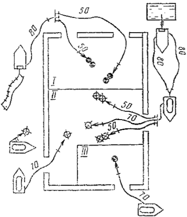 I - тушение пеной средней кратности, подаваемой двумя ручными пожарными стволами; II - тушение распыленной струёй, подаваемой двумя ручными пожарными стволами Dу 50 мм и компактной струёй, подаваемой двумя ручными пожарными стволами Dу 70 мм; III - тушение пеной низкой кратности, подаваемой ручным пожарным стволом