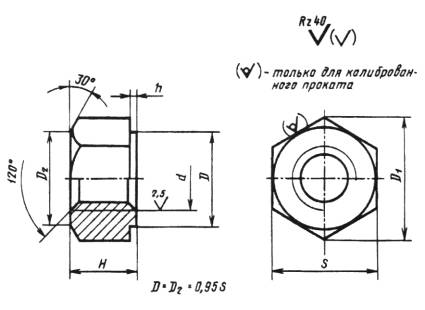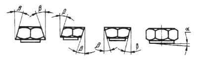 Допустимый уклон граней (угол Черт. 2. 2.10. Обработанные поверхности гаек не должны иметь трещин, надрывов. 2.11. Резьба должна быть чистой и не должна иметь заусенцев, рванин, ниток с сорванной или неполной резьбой. Вмятины на резьбе, препятствующие ввинчиванию проходного калибра, не допускаются. 2.12. Гайки, применяемые при температуре до 200 °С, по заказу потребителя следует изготовлять с покрытием. Вид покрытия - по ГОСТ 9.303. Толщина покрытия - по ГОСТ 9.306. Условное обозначение покрытия - по ГОСТ 1759.0. 2.13. Защитные покрытия должны быть однородными, пузыри и отслаивания не допускаются. 2.14. Требования к шероховатости под покрытие - по ГОСТ 9.301. 3. ПРАВИЛА ПРИЕМКИ3.1. Правила приемки - по ГОСТ 17769. 3.2. Каждая гайка должна быть подвергнута проверке на соответствие требованиям п.п. 1.1, 2.7 - 2.14, 5.1, 5.2. 3.3. Гайки следует предъявлять к приемке партиями. Партия должна состоять из гаек одного обозначения, изготовленных из одной партии заготовок. 3.4. Проверку гаек на соответствие требованиям п. 2.5 следует проводить на основании результатов испытаний каждой партии заготовок. 3.5. Партия заготовок должна состоять из металла одной плавки и одной садки при термической обработке. 3.6. Испытания заготовок на твердость следует проводить в объеме 100 %. При длине заготовки 500 мм и более твердость измеряют на обоих концах и по ее длине с интервалом не более 500 мм. 3.7. Один процент от партии заготовок, но не менее 2 шт., с нижним и верхним значениями твердости в данной партии следует подвергать испытаниям на соответствие требованиям п. 2.5. Допускается отбирать заготовки для механических испытаний с промежуточными значениями твердости. В этом случае твердость является сдаточной характеристикой. 3.8. Число испытываемых образцов от каждой контролируемой заготовки должно быть: один - на растяжение и два - на ударную вязкость. 3.9. При получении неудовлетворительных результатов испытания механических свойств хотя бы одного образца, следует проводить повторные испытания удвоенного числа образцов из тех же заготовок или других этой же партии с той же твердостью только по виду испытаний, давших неудовлетворительный результат. 3.10. Партию считают годной, если при повторных испытаниях получены положительные результаты. При получении неудовлетворительных результатов испытаний партия заготовок может быть предъявлена к приемке вновь после испытания заготовок с последующим уровнем твердости. 3.11. Заготовки с твердостью, не обеспечивающей получение требуемых механических свойств, указанных в табл. 3, могут быть допущены к сдаче после повторной термической обработки с проведением соответствующих испытаний. Число повторных термических обработок должно быть не более двух. Дополнительный отпуск не считают повторной термической обработкой. 4. МЕТОДЫ ИСПЫТАНИЙ4.1. Внешний осмотр (п.п. 2.10, 2.11, 5.1, 5.2) следует проводить без применения увеличительных приборов. 4.2. Размеры гаек (п. п. 1.1, 2.7 - 2.9) следует проверять предельными калибрами, шаблонами, универсальными измерительными инструментами. 4.3. Определение твердости (п. 2.5) - по ГОСТ 9012. 4.4. Испытание на растяжение (п. 2.5) - по ГОСТ 1497. 4.5. Испытание на ударную вязкость (п. 2.5) - по ГОСТ 9454, образец типа 1. 4.6. Метод отбора проб - по ГОСТ 7564. 4.7. Методы проверки качества и толщины покрытия (п.п. 2.12 - 2.14) - по ГОСТ 9.302. Толщину покрытия проверяют на торцах или гранях гайки. 