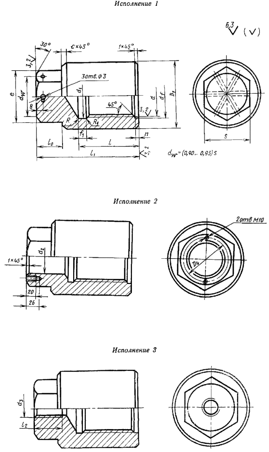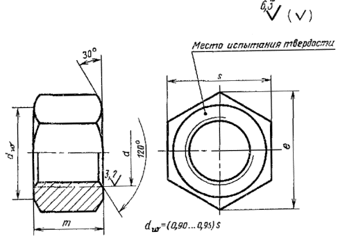Н14, hl4, ± 3. Допускается изготовление гаек типа Б без расточки осевого отверстия п с фаской. 4. Допускается увеличение размера проточки f1 до 35 мм для гаек свыше М72 с соответствующим увеличением высоты гайки. При изготовлении проточки типа короткая по ГОСТ 10549-80 допускается уменьшение общей высоты гайки l1 и глубины осевого отверстия I по сравнению с таблицей, но не более 10 мм. 5. Допускается в основании гаек типа Б выполнять площадки или канавки для стопорения. 6. Допускается для гаек типа А, изготовляемых ковкой, предельные отклонения для размера «под ключ» по hl6. Примеры условных обозначений Гайки типа А, диаметром резьбы 12 мм с крупным шагом резьбы 1,75 мм с полем допуска 6Н, из углеродистой стали 35, категории III, с покрытием 02 толщиной 6 мкм: Гайка AM12-6H.35.III.026 ГОСТ 9064-75 То же, типа Б, исполнения 2, диаметром резьбы 48 мм, с мелким шагом резьбы 3 мм, с толем допуска 6Н, из стали марки ЭП182 вакуумно-дугового переплава, категории IV, группы качества 3, без покрытия: Гайка Б2М48´З-6Н.ЭП182-ВД.IV.З ГОСТ 9064-75 (Измененная редакция, Изм. № 1, 2). 4. Резьба метрическая - по ГОСТ 24705-81. (Измененная редакция, Изм. № 2). 5. Масса гаек приведена в справочном приложении 1. 6. Технические требования - по ГОСТ 20700-75. 7. (Исключен, Изм. № 2). ПРИЛОЖЕНИЕ 1