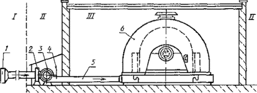 I - пространство в невзрывоопасной зоне из которого забирается атмосферный воздух для применения в качестве защитного газа; II - невзрывоопасная зона, III - взрывоопасная зона