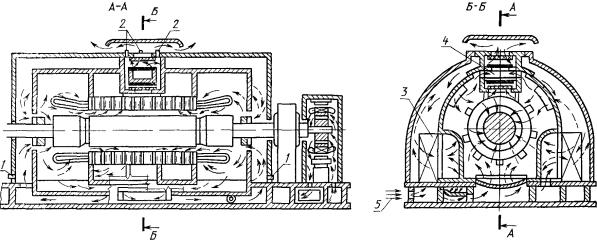 1 - вентилятор подачи защитного газа; 2 - входящий газопровод, 3 – электродвигатель; 4 - охладитель защитного газа; 5 - внутренний вентилятор; 6 - ось вращения; 7 - минимально допустимое значение избыточного давления защитного газа согласно настоящему стандарту; 8 - минимально допустимое значение избыточного давления за элитного газа на входе в оболочку электродвигателя (точка В), необходимое для создания у внутренних стенок оболочки электродвигателя избыточного давления не менее 100 Па; 9 - изменение избыточного давления защитного газа по входящему газопроводу и по линии движения защитного газа АВС DEFB внутри оболочки электродвигателя при нормальной работе