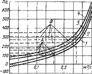 А - минимально допустимые значения избыточного давления и расхода защитного газа, при которых должны срабатывать блокировки; В - минимальные значения избыточного давления и расхода защитного газа при нормальной работе электродвигателя с учетом значения дифференциала прибора контроля избыточного давления