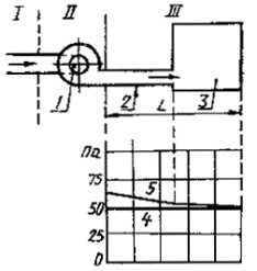 1 - вентилятор подачи защитного газа; 2 - входящий газопровод, 3 - оболочка электрооборудования, 4 - минимально допустимое значение избыточного давления защитного газа согласно настоящему стандарту, 5 - изменение значения избыточного давления защитного газа при работе электрооборудования