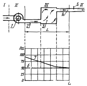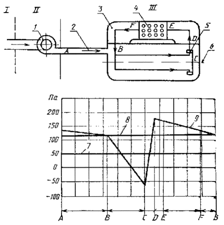 1 - вентилятор подачи защитного газа; 2 - входящий газопровод; 3 - оболочка электрооборудования; 4 - исходящий газопровод; 5 - заслонка для регулирования значения избыточного давления; 6 - минимально допустимое значение избыточного давления защитного газа согласно настоящему стандарту; 7 - изменение значения избыточного давления защитного газа при работе электрооборудования