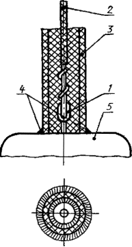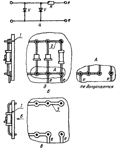 Примечания: 1. В знаменателе указаны составы смесей для искрообразующих механизмов II и III типов. (Измененная редакция, Изм. № 1). а) первичную обмотку трансформатора, питающего искробезопасные цепи; б) первичную обмотку разделительного трансформатора; в) первичную (вторичную) обмотку выходного трансформатора усилителя, генератора, преобразователя; г) цепи питания выходного каскада усилителя, генератора, преобразователя, содержащие трансформаторы. (Измененная редакция, Изм. № 1). 2.8.14. В электрооборудовании с уровнем взрывозащиты РП (Ис), 2 (ic) дополнительную коммутацию в нормальном режиме проводят только при наличии в искробезопасных цепях нормально искрящих контактов. 2.8.15. Элементы электрооборудования, в том числе и неудовлетворяющие требованиям настоящего стандарта, при испытаниях по п. 2.8.12 не повреждаются. При испытаниях цепей постоянного (выпрямленного) тока полярность источника питания на контактах искрообразующего механизма должна изменяться через каждые 8000 размыканий и замыканий цепи. Примерная форма протокола испытаний приведена в приложении 10. (Измененная редакция, Изм. № 1). 2.8.19. Допускается производить оценку искробезопасности цепей по характеристикам искробезопасности, приведенным в справочном приложении 3 без испытаний во взрывной камере. Действующие в цепях токи и напряжения в этом случае уменьшают на 30 % по сравнению с их искробезопасными значениями, полученными по характеристикам. Пример выполнения искрозащитного блока на диодах с проволочными выводами а - электрическая схема; б - навесной монтаж; в - печатный монтаж; V - шунтирующий диод; R - ограничительный резистор; е-е - к искробезопасной цепи (шунтирующему элементу); 1 - панель; 2 - провод; 3 - печатный проводник Черт. 1 Пример выполнения искрозащитного тиристорного блока а - электрическая схема; б - навесной монтаж; в - печатный монтаж; V - шунтирующий диод; R - ограничительный резистор; е-е- к искробезопасной цепи (шунтирующему элементу); 1 – панель; 2 – провод; 3 – лепесток; 4 - печатный проводник Черт. 2 Пример посадки на клей изоляционной трубки 1 - место присоединения провода; 2 - изоляция провода; 3 - изоляционная трубка; 4 - места заполнения изоляционным клеем; 5 - основание штепсельного разъема Черт. 3 ПРИЛОЖЕНИЕ 1