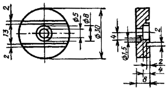 Искрообразующий механизм прерывистого контактирования (черт. 1) состоит из вращающегося металлического диска, по окружности которого расположены 10 оцинкованных стальных проволочек диаметром 0,4 мм. В качестве неподвижного электрода служит стальная пилочка толщиной 0,25-0,3 мм с высотой зуба 0,4-0,5 мм. Свободная длина оцинкованной стальной проволочки составляет примерно 25 мм. Пилочка жестко закреплена в двух точках на специальной скобе. Расстояние между точками закрепления составляет примерно 70 мм, радиус закругления пилочки - примерно 100 мм. При подсчете числа искрений каждое контактирование с пилочкой учитывается как одно искрение. Частота вращения подвижных контактов - около 40¸60 об/мин. В случае использования данного механизма для испытаний емкостных цепей должно быть исключено постоянное соприкосновение нескольких стальных проволок с диском пилы. Например, можно установить определенное число стальных проволок для того, чтобы достичь полной зарядки емкости в интервалах между отдельными сериями искр. При оценке емкостных цепей регистрируется каждое соприкосновение стальной проволоки с диском пилы как одно искрение.