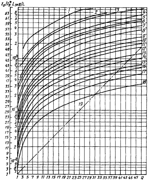 1 - К = 0,58; 2 - К = 0,73; 3 - К = 0,87; 4 - К = 1,18; 5 - К = 1,39; 6 - К = 1,5; 7 - К = 1,9; 8 - К = 2,25; 9 - К = 3,08; 10 - К = 3,6; 11 - К = 4,5; 12 - К = 4,8; 13 - К = 6,55; 14 - К = = 8; 15 - К = 10,7; 16 - К = 12,5; 17 - К = 16,7; 18 - К = 25; 19 - Iо/Iо* = (а).