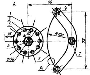 1 - подвижный контакт; 2 - неподвижный контакт; 3 - диск подвижного контакта; 4 - пластина неподвижного контакта; 5 - крепежный болт подвижного контакта; 6 - вращающийся вал подвижного контакта; 7 - крепежная стойка неподвижного контакта