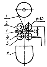 1 - барабан с проволокой; 2 - ролики подающие диаметром 50 мм; 3 - индикатор взрывов смеси; 4 - взрывная колбочка и проволока; 5 - ролики принимающие; 6 - короб для проволочек