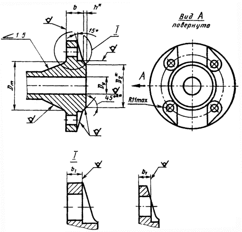 Срок действия с 01.01.83 Требования пп. 1 - 3; 5; 7 настоящего стандарта являются обязательными, остальные требования - рекомендуемыми. 2. Конструкция и размеры фланцев должны соответствовать указанным на чертеже и в таблице. 1, 2. (Измененная редакция, Изм. № 1, 2). 3. Фланцы должны изготовляться с уплотнительными поверхностями исполнений 1, 2, 3 и присоединительными размерами по ГОСТ 12815-80. 4. Предельные отклонения размеров отливок - по 9 классу точности ГОСТ 26645-85. (Измененная редакция, Изм. № 2). 5. Неуказанные размеры и предельные отклонения - по рабочим чертежам, утвержденным в установленном порядке. 6. Допускается изготовление фланцев Dy 15 мм без скоса под углом 15° и выемки по радиусу R 11 max, а также квадратных фланцев со скосом от 8 до 15°. 7. Технические требования, материал фланцев, крепежных деталей и прокладок - по ГОСТ 12816-80. ______________________ * D2 и h - по ГОСТ 12815-80. ** Допускается выполнять скругление. мм