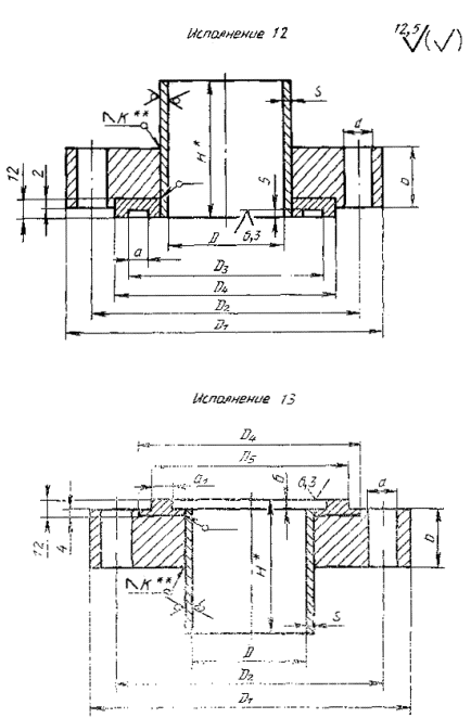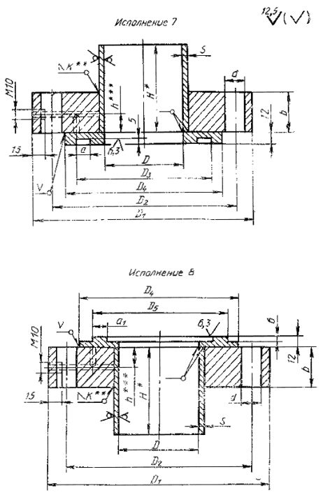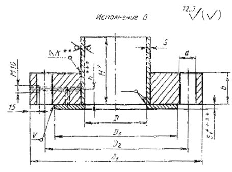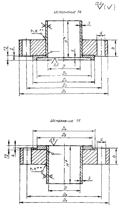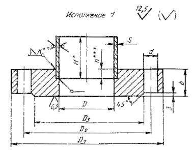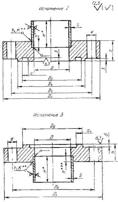 Дата введения 01.01.92 Настоящий стандарт распространяется на стальные плоские приварные фланцы для сосудов и аппаратов диаметром от 400 до 4000 мм с условным давлением от 0,3 до 1,6 МПа при температуре рабочей среды от минус 70°С до плюс 300°С, предназначенных для работы в химической, нефтехимической, нефтеперерабатывающей и других отраслей промышленности, и направлен на обеспечение взаимозаменяемости и унификации фланцев сосудов и аппаратов. Пределы применения фланцев в зависимости от материала и температуры должны соответствовать ГОСТ 28759.1. Требования п. 1.2 в части показателей «Внутренний диаметр аппарата D», D1, D2, D3, D4, D5; п. 1.4 в части показателя «Внутренний диаметр аппарата D» настоящего стандарта являются обязательными, другие требования настоящего стандарта являются рекомендуемыми. 1. КОНСТРУКЦИЯ И РАЗМЕРЫ1.1. Стандарт устанавливает конструкции фланцев следующих исполнений: 1 - с гладкой уплотнительной поверхностью; 2 - с пазом; 3 - с шипом; 4 - с впадиной; 5 - с выступом; 6 - с гладкой уплотнительной поверхностью, облицованные листом из коррозионно-стойкой стали; 7 - с пазом, облицованные листом из коррозионно-стойкой стали; 8 - с шипом, облицованные листом из коррозионно-стойкой стали; 9 - с впадиной, облицованные листом из коррозионно-стойкой стали; 10 - с выступом, облицованные листом из коррозионно-стойкой стали; 11 - с гладкой уплотнительной поверхностью, наплавленные коррозионно-стойкой сталью; 12 - с пазом, наплавленные коррозионно-стойкой сталью; 13 - с шипом, наплавленные коррозионно-стойкой сталью; 14 - с впадиной, наплавленные коррозионно-стойкой сталью; 15 - с выступом, наплавленные коррозионно-стойкой сталью. 1.2. Конструкция и размеры фланцев должны соответствовать черт. 1-9 и табл. 1.