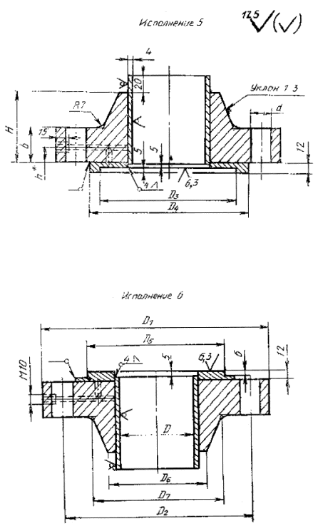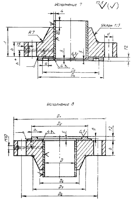 Дата введения 01.01.92 Настоящий стандарт распространяется на стальные приварные встык фланцы для сосудов и аппаратов с внутренним диаметром от 400 до 4000 мм и наружным базовым размером (днища, трубы) от 426 до 720 мм с условным давлением от 0,6 до 6,3 МПа, при температуре рабочей среды от минус 70°С до плюс 540°С, предназначенные для работы в химической, нефтехимической, нефтеперерабатывающей и других отраслях промышленности. Пределы применения фланцев в зависимости от материала и температуры должны соответствовать ГОСТ 28759.1. Требования п. 1.2 в части показателей «Внутренний диаметр аппарата D», D1, D2, D3, D4, D5, D6, D7, п. 1.4 в части показателя «Внутренний диаметр аппарата D «настоящего стандарта являются обязательными, другие требования настоящего стандарта являются рекомендуемыми. 1. КОНСТРУКЦИЯ И РАЗМЕРЫ1.1. Стандарт устанавливает конструкции фланцев следующих исполнений: 1 - с впадиной; 2 - с выступом; 3 - с пазом; 4 - с шипом; 5 - с впадиной, облицованные листом из коррозионно-стойкой стали; 6 - с выступом, облицованные листом из коррозионно-стойкой стали; 7 - с пазом, облицованные листом из коррозионно-стойкой стали; 8 - с шипом, облицованные листом из коррозионно-стойкой стали; 9 - с впадиной, наплавленные коррозионно-стойкой сталью; 10 - с выступом, наплавленные коррозионно-стойкой сталью; 11 - с пазом, наплавленные коррозионно-стойкой сталью; 12 - с шипом, наплавленные коррозионно-стойкой сталью. 1.2. Конструкция м размеры фланцев должны соответствовать черт. 1-6 и табл. 1 и 2.