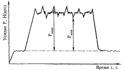 где m0 - масса подложки, г; m1 - масса герметизирующего материала с подложкой до испытания, г; m2 - масса герметизирующего материала с подложкой после испытания, г. Результат округляют до 0,01 %. 3.6 Определение липкостиСущность метода заключается в измерении усилия сцепления герметизирующего материала с поверхностью. 3.6.1 Средства испытания и вспомогательные устройства Машина разрывная с кинематической схемой нагружения, обеспечивающая: - измерение усилия с погрешностью не более 1,0 %; - скорость движения подвижной траверсы от 10 до 1000 мм/мин; - запись диаграммы «усилие - время». Масштаб записи выбирают таким образом, чтобы диаграмма была аналогична приведенной на рисунке 9. Рисунок 7 1 - нижний зажим; 2, 8 - затягивающие винты; 3 - закрепляющий винт; 4 - противовес; 5, 5¢ - нагружающие рычаги; 6, 6¢ - оси; 7 - ролик; 9 - верхний зажим, 10, 11 - фиксирующие винты; 12 - основание приспособления Пресс, обеспечивающий усилие до 2000 Н (200 кгс). Приспособление для определения липкости (рисунок 7). Ролики со сферической рабочей поверхностью с радиусом закругления 20 мм. Материал роликов должен быть указан в нормативном документе на конкретный вид герметизирующего материала. Шкаф электрический сушильный, обеспечивающий поддержание температуры в диапазоне 50 - 100°С. Лупа измерительная с погрешностью не более 0,1 мм по ГОСТ 25706. Линейка металлическая по ГОСТ 427. Штангенциркуль по ГОСТ 166. Подложки дюралюминиевые или из органического стекла по ГОСТ 9784 размером [(250´35)±2] мм, толщиной (5±0,5) мм (рисунок 8). Плиты стальные размером [(280´70´20)±2] мм. Ограничители стальные размером [(50´10)±2] мм и толщиной (0,25±0,01) мм. Нож или скальпель по ГОСТ 21240. Рисунок 8 1 - подложка; 2 - испытываемый материал; 3 - антиадгезионная бумага; 4 - риски; 5 - прорезь Ацетон по ГОСТ 2768. Бумага антиадгезионная или другие материалы, обладающие антиадгезионными свойствами и исключающие налипание герметизирующего материала к плитам пресса. Ткань хлопчатобумажная или фланель. 3.6.2 Подготовка к проведению испытания 3.6.2.1 Подготовка образцов из мастик Испытание проводят на трех образцах. На боковую поверхность подложки наносят риски Р1 и Р2 (рисунок 8). На обезжиренную ацетоном подложку вдоль продольной оси с двух сторон наносят герметизирующий материал в форме валика диаметром 5-6 мм. Длина валика должна быть такой, чтобы расстояние от края материала до риски Р1 составляло (10±1) мм. Сразу после нанесения герметизирующий материал закрывают антиадгезионной бумагой. Подготовленную подложку помещают на стальную плиту пресса. Между антиадгезионной бумагой и подложкой с обеих сторон устанавливают четыре ограничителя, по два с каждой стороны. Ограничители должны находиться напротив рисок Р1 (рисунок 8). На подложку с герметизирующим материалом, закрытым антиадгезионной бумагой, накладывают вторую стальную плиту и прессуют с усилием (2000±40) Н [(200±4) кгс] до соприкосновения плит с ограничителями. Образец выдерживают при заданном усилии в течение 2-3 мин. Образец отбраковывают, если герметизирующий материал касается хотя бы одного из четырех ограничителей. Ограничители удаляют. Герметизирующий материал и антиадгезионную бумагу, выходящие за боковые грани подложки, срезают скальпелем. На антиадгезионной бумаге с двух сторон подложки скальпелем делают по две прорези. Прорези должны находиться напротив рисок Р2 (рисунок 8). 3.6.2.2 Подготовка 