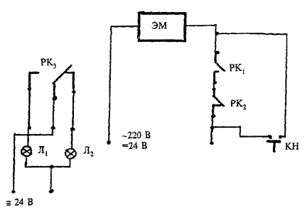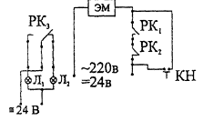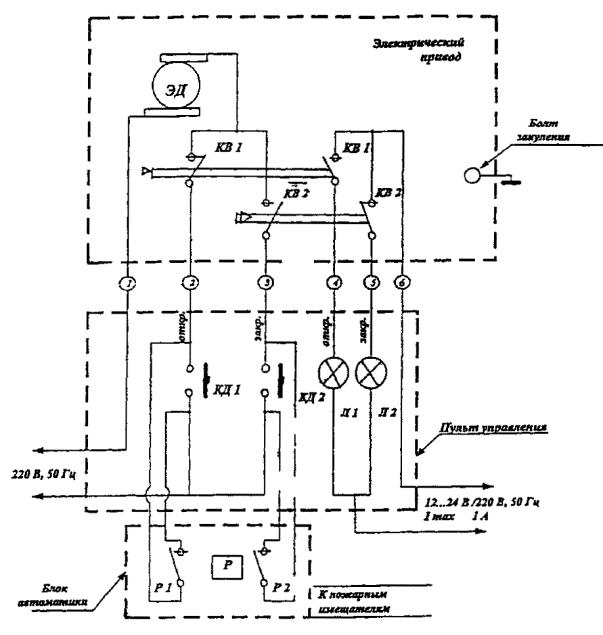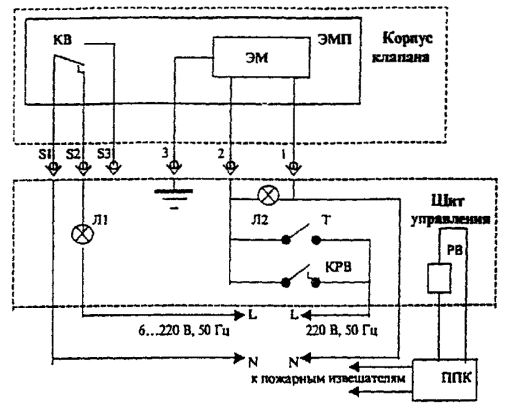 ЭМП - электромагнитный привод; ЭМ - электромагнит; КВ - концевой выключатель; Л1, Л2 - лампы световой сигнализации; Т - тумблер включения/выключения электропитания; РВ, КРВ - реле времени, контакт реле времени; ППК - прибор приемно-контрольный Электрическая схема подключения клапана КДМ-2 с приводом «Веlimо»