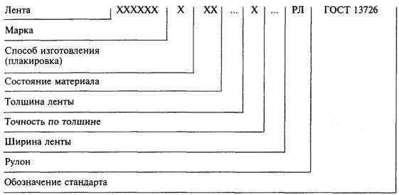 где Нмакс, Нмин - наибольшие и наименьшие размеры по толщине, мм; Вмакс, Вмин - наибольшие и наименьшие размеры по ширине, мм; g - плотность алюминиевого сплава, г/см3. Теоретическая масса ленты вычислена при плотности 2,85 г/см3, что соответствует плотности алюминиевых сплавов марок В95 и В95-1 и приведена в приложении А. Для вычисления теоретической массы лент из алюминия и алюминиевых сплавов других марок следует пользоваться переводными коэффициентами, указанными в приложении Б. 4.2.15 Марку и состояние материала, плакировку, размеры и точность изготовления лент потребитель указывает в заказе. При отсутствии требований в заказе точность изготовления определяет изготовитель. Условные обозначения лент при заказе проставляют по схеме: