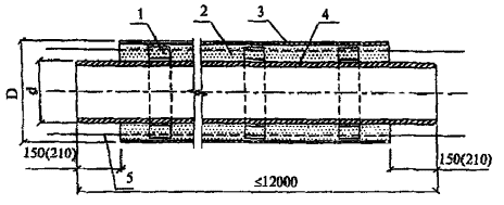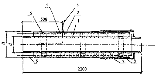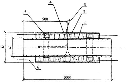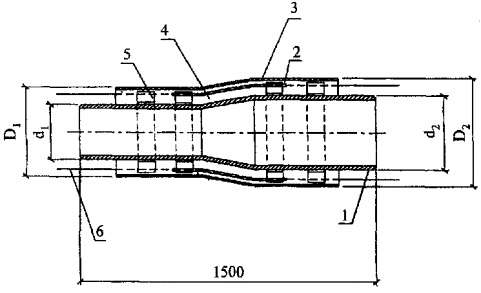 1 - стальная труба; 2 - электроизоляционная трубка по ГОСТ 22056; 3 - оболочка из полиэтилена; 4 - изоляция из пенополиуретана; 5 - центрирующая опора; 6 - проводник-индикатор системы ОДК Рисунок В.2 - Переход Таблица В.2 - Переход В миллиметрах