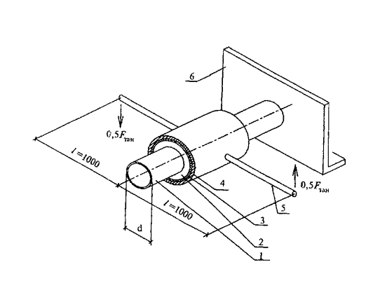 где Fакс - осевая нагрузка, Н L - длина образца, мм; d - наружный диаметр трубы, мм. 9.19 Прочность на сдвиг в осевом направлении при температуре (140±2) °С определяют в соответствии с требованиями настоящего стандарта при нагреве стальной трубы в течение 30 мин до 140 °С и ее выдержке при этой температуре в течение 30 мин до приложения нагрузки. 1 - стальная труба; 2 - труба-оболочка из полиэтилена; 3 - изоляция из пенополиуретана; 4 - направляющее кольцо; 5 - плита основания машины для испытания Рисунок 2 9.20 Прочность, на сдвиг в тангенциальном направлении при температуре (23±2) °С определяют на отдельно изготовленном образце или на фрагменте изолированной трубы, из которой выделяют поперечными разрезами до стальной трубы слой тепловой изоляции длиной, равной 0,75 диаметра стальной трубы, но не менее 100 мм (рисунок 3). 1 - стальная труба; 2 - изоляция из пенополиуретана; 3 - труба-оболочка из полиэтилена; 4 - хомут; 5 - рычаг; 6 - неподвижная опора Рисунок 3 Тангенциальную нагрузку прилагают к полиэтиленовой оболочке с помощью двух рычагов длиной по 1000 мм, расположенных соосно горизонтально с двух сторон оболочки. Скорость приложения нагрузки к концам рычагов должна быть равна 25 мм/мин. Прочность
