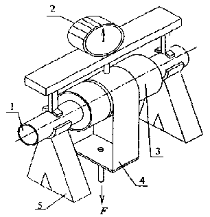 где L - длина образца, мм; d - наружный диаметр трубы, мм; l - длина каждого рычага, мм. 9.21 Прочность на сдвиг в тангенциальном направлении при температуре (140±2) °С определяют в соответствии с 9.20 на образцах изолированных труб длиной 3 м на выделенных не менее трех участках тепловой изоляции, расположенных на расстоянии не менее 1 м от торцов теплоизоляции. При этом по трубе пропускают теплоноситель с температурой 170 °С в течение 1450 ч. Затем температуру теплоносителя снижают до 140 °С и после выдержки в течение суток определяют значение прочности по 9.20. 9.22 Радиальную ползучесть тепловой изоляции труб определяют на трех образцах с диаметром стальной трубы 57 мм, наружным диаметром полиэтиленовой оболочки 125 мм и длиной теплоизоляции 250 мм на выделенном поперечными разрезами фрагменте тепловой изоляции длиной 100 мм. Свободные от тепловой изоляции концы стальных труб должны опираться на скользящие опоры согласно рисунку 4. По образцам пропускают теплоноситель с температурой (140 ± 2)°С в течение одной недели, после чего к фрагменту изоляции прилагают вертикальную нагрузку (1,5 ± 0,01) кН (рисунок 4). 1 - стальная труба; 2 - индикатор; 3 - труба-оболочка из полиэтилена и изоляция из пенополиуретана; 4 - приспособление для приложения нагрузки; 5 - опора Рисунок 4 Радиальную ползучесть тепловой изоляции замеряют в верхней части середины фрагмента до начала нагрузки (исходное значение) и в период воздействия нагрузки через 100 ч и через 1000 ч. Замеры производят индикатором часового типа с точностью до 0,05 мм. Величину радиальной ползучести определяют как среднеарифметическое значение результатов испытаний трех образцов. 9.23 Стойкость полиэтиленовой оболочки при постоянном внутреннем давлении определяют на образцах трубы-оболочки по ГОСТ 24157. 10 Транспортирование и хранение10.1 Перевозку изолированных труб и фасонных изделий осуществляют автомобильным, железнодорожным и водным транспортом в соответствии с правилами перевозки грузов, обеспечивающими сохранность изоляции и исключающими возникновение продольного прогиба. 10.2 Перевозку труб и фасонных изделий, погрузочно-разгрузочные работы осуществляют в интервале температур, указанных для проведения строительно-монтажных работ, но не ниже минус 18 °С. 10.3 Для погрузки и разгрузки труб и фасонных изделий следует применять специальные траверсы и мягкие полотенца шириной 50 - 200 мм. Не допускается использовать цепи, канаты и другие грузозахватные устройства, вызывающие повреждение изоляции. Для труб диаметром более 108 мм возможно использование торцевых захватов со специальными траверсами. 10.4 Строго запрещается сбрасывание, скатывание, соударение труб, волочение их по земле. 10.5 Укладку труб в транспортные средства необходимо производить ровными рядами, не допуская перехлестов. В качестве амортизатора между трубами с целью исключения повреждения покрытия следует использовать поролон, резину и т.п. Для обеспечения свободного пропуска обвязок между трубами и дном кузова автомашины укладывают прокладки. Не допускается раскатывание нижнего ряда труб при транспортировании. 10.6 Трубы и фасонные изделия должны храниться на ровных горизонтальных площадках, очищенных от камней и других посторонних предметов, которые могут привести к повреждению полиэтиленовой оболочки. 10.7 Складирование труб производят шта