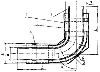 1 - стальная труба; 2 - изоляция из пенополиуретана; 3 - оболочка из полиэтилена; 4 - центрирующая опора; 5 - стальной отвод; 6 - электроизоляционная трубка по ГОСТ 22056; 7 - проводник-индикатор системы ОДК Рисунок В.1 - Отвод Таблица B.1- Отвод В миллиметрах