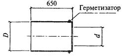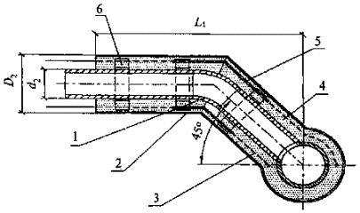 1 - стальная труба; 2 - оболочка из полиэтилена; 3 - кабельный вывод; 4 - изоляция из пенополиуретана; 5 - центрирующая опора; 6 - проводник-индикатор системы ОДК. Рисунок В. 10 - Элемент трубопровода с кабелем вывода В.10.2 Пример условного обозначения элемента трубопровода с кабелем вывода диаметром 57 мм с изоляцией типа 1: Элемент трубопровода с кабелем вывода Ст 57-1-ППУ-ПЭ ГОСТ 30732-2001 В.11 Концевой элемент трубопровода с кабелем вывода В.11.1 Конструкция и размеры концевого элемента трубопровода с кабелем вывода должны соответствовать рисунку В.11.