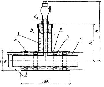 1 - стальной отвод; 2 - оболочка из полиэтилена; 3 - проводник-индикатор системы ОДК; 4 - изоляция из пенополиуретана; 5 - электроизоляционная трубка по ГОСТ 22056; 6 - центрирующая опора Рисунок В.4 - Тройниковое ответвление В.4.2 Пример условного обозначения тройникового ответвления диаметром 426-219 мм с изоляцией типа 1: Тройниковое ответвление Ст 426-219-1 ППУ-ПЭ ГОСТ 30732-2001 Таблица В.4 - Тройниковое ответвление В миллиметрах