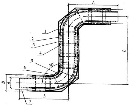 1 - оболочка из полиэтилена; 2 - стальная труба; 3 - изоляция из пенополиуретана; 4 - центрирующая опора; 5 - стальной отвод; 6 - электроизоляционная трубка по ГОСТ 22056; 7 - проводник-индикатор системы ОДК. Рисунок B.7 - Z-образный элемент В.7.2 Пример условного обозначения Z-образного элемента диаметром 108 мм с изоляцией типа 1: Z-образный элемент Ст 108-1-ППУ-ПЭ ГОСТ 30732-2001. Таблица В.9 - Z-образный элемент В миллиметрах