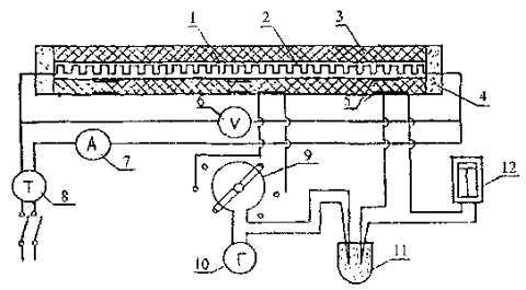 1 - стальная труба; 2 - электронагреватель; 3 - испытуемый материал; 4 - изоляция; 5 - термопары; 6 - вольтметр; 7 - амперметр; 8 - автотрансформатор; 9- переключатель; 10 - гальванометр; 11 - сосуд со льдом; 12 - самопишущий гальванометр. Рисунок E.1 Нагревательный элемент разделяют на три самостоятельные секции по длине трубы. Центральная секция, занимающая 1/3 длины трубы, является рабочей, боковые секции служат для устранения утечек теплоты через торцы. Трубу устанавливают на подставках на расстоянии 1,5-2 м от пола и стен помещения, в котором производят испытания. Измерения температуры трубы и поверхности испытуемого материала производят термопарами. Путем регулировки электрической мощности, потребляемой охранными секциями, необходимо добиваться отсутствия перепада температур между рабочей и охранными секциями. Испытания проводят при установившемся тепловом режиме, при котором температура на поверхности трубы и изоляции постоянна во времени. Расход электрической энергии рабочим нагревателем может определяться как ваттметром, так и отдельно вольтметром и амперметром. Теплопроводность тепловой изоляции λ, Вт/м×°С, определяют по формуле