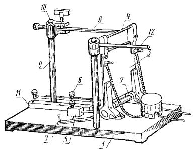 1 - опорная плита; 2 - подшипники вращения; 3 - изоляционная пластина держателя стержня каления; 4 - стержень каления; 5 - противовес; 6 - ограничительный винт; 7 - рычаг; 8 - образец; 9 - стойка держателя образца; 10 - держатель образца (зажим); 11 - салазки; 12 - установочный металлический стержень. держатель стержня каления, установленный на подшипниках вращения, способный поворачиваться вокруг горизонтальной оси. Держатель состоит из пластины из изоляционного материала (асбест, керамика) с двумя зажимами, в которые вставляются металлизированные концы стержня каления; держатель образца, укрепленный на стойке, перемещаемый на опорной плите при помощи салазок с целью обеспечения испытания образцов различной длины; установочный стержень диаметром 8 мм, предназначенный для предварительной настройки положения торцовой поверхности образца по отношению к стержню каления;