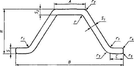 oblique-angled trapezoidal flanged-section shapes of aluminum, Дата введения 1999-01-01 1 ОБЛАСТЬ ПРИМЕНЕНИЯНастоящий стандарт устанавливает сортамент прессованных косоугольных трапециевидных профилей отбортованного сечения из алюминия, алюминиевых и магниевых сплавов, изготовляемых методом горячего прессования. 2 НОРМАТИВНЫЕ ССЫЛКИВ настоящем стандарте использованы ссылки на следующие стандарты: ГОСТ 8617-81 Профили прессованные из алюминия и алюминиевых сплавов. Технические условия ГОСТ 19657-84 Профили прессованные из магниевых сплавов. Технические условия 3 ОСНОВНЫЕ ПАРАМЕТРЫ3.1 Номера профилей и размеры должны соответствовать приведенным на рисунке 1 и в таблице 1. Рисунок 1 Таблица 1- Номера профилей, размеры и теоретическая масса