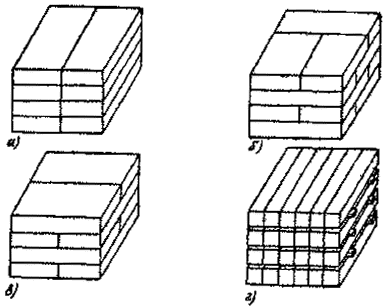 Рис. 15. Укладка в штабеля пакетов паркетной доски 6.5.11. Учет паркетных досок и наборного паркета производится в штуках и квадратных метрах с точностью до 0,01 м2, а штучного паркета - в штуках и квадратных метрах с точностью до 0,001 м2. 6.6. Плиты столярные по ГОСТ13715-786.6.1. Плиты столярные изготавливаются из блочно-шпоночных, блочно-реечных или реечных щитов (серединок), оклеенных с обеих сторон шпоном (рубашками). Плиты подразделяются на: облицованные строганой фанерой и необлицованные; шлифованные и нешлифованные; плиты обычной и повышенной точности; плиты, склеенные белковыми или искусственными смолами. 6.6.2. Все виды гнили и обзол в рейках щитов не допускается. На поверхности плит не должно быть пятен и следов клея. Влажность плит должна быть не выше 8±2%. Плиты должны быть прочно склеены. 6.6.3. При отгрузке плиты столярные должны упаковываться отдельно по типам, конструкциям, сортам и размерам. В пачках весом до 80 кг лицевые стороны плит должны быть обращены внутрь пачки; снаружи пачки плиты покрываются обложками из фанеры или сухого шпона для предохранения рубашек плит от загрязнения и порчи. 6.6.4. Транспортирование плит в пачках должно производиться в сухих и чистых транспортных средствах. 6.6.5. Хранить столярные плиты следует в закрытых складах уложенными в штабеля по сортам, типам, размерам. 6.7. Фанера6.7.1. Фанера подразделяется на: фанеру клееную марок ФСФ, ФК, ФБА по ГОСТ 3916-69; декоративную марок ДФ1, ДФ2 по ГОСТ 14614-79; облицованную строганым шпоном марок ФОФ и ФОК по ГОСТ 11519-77; и бакелизированную марок ФБС, ФБВ и ФБСВ по ГОСТ 11539-83. 6.7.2. При упаковке лицевые стороны фанеры всех видов и сортов должны быть обращены внутрь пачки. Между листами односторонней декоративной фанеры прокладывается лист бумаги по формату фанеры. 6.7.3. Фанера должна поставляться упакованной в отдельные пачки по породам, размерам, сортам, виду обработки поверхности, цвету, рисунку и маркам. 6.7.4. На листах фанеры не допускаются пузыри, расслоения и недопрессовки; на рубашках бакелизированиой фанеры не должно быть непропитанных или непромазанных смолой участков. 6.7.5. Отгружаемые пачки фанеры должны быть покрыты сверху и снизу обложками из листов клееной фанеры, шпона или плетенками из шпона с применением деревянных планок или веревки, обеспечивающих сохранность фанеры при транспортировании. Вес пачки - не более 80 кг. 6.7.6. Фанера должна перевозиться в сухих и чистых транспортных средствах с предохранением ее от атмосферных осадков и храниться в сухих закрытых и проветриваемых складских помещениях, в условиях, не допускающих ее порчи, в штабелях высотой до 1,5 м, отдельно по видам, сортам, размерам. 6.7.7. Учет фанеры ведется в кубических или квадратных метрах. Объем одного листа фанеры определяется с точностью до 0,00001 м3, а объем партии фанеры - с точностью до 0,01 м3. Площадь листа фанеры учитывается с точностью до 0,01 м2, а площадь листов в партии - с точностью до 0,05 м2. 6.8. Плиты древесноволокнистые6.8.1. Древесноволокнистые плиты для полов должны быть окрашены по всей толщине или иметь грунтовочное покрытие под окраску лицевой поверхности. 6.8.2. Допускаемая влажность сверхтвердых, твердых к полутвердых плит от 6 до 10%, изоляционно-отделочных - не более 12%. Лицевая поверхность сверхтвердых и твердых плит должна быть гладкой, без впадин, выпуклостей и масляных пятен. Плиты не должны рассл