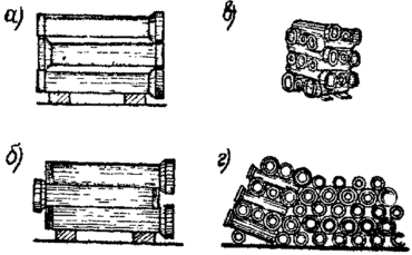керамической плитки: Рис. 7. Укладка керамических труб в штабеля: Между листами стекла в середине контейнера должны быть установлены предохранительные перегородки. 3.1.5. Пространство между листами стекла и стенками ящика должно быть заполнено древесной стружкой или другим уплотняющим материалом (гофрированным картоном, древесно-волокнистой плитой и др.) 3.1.6. Контейнеры или ящики с листами стекла транспортируют любым видом транспорта. 3.1.7. При хранении листы стекла должны быть установлены на пирамиды или стеллажи на резиновые, войлочные или деревянные подкладки, в наклонном положении, с углом наклона к вертикали 10-15°. Если оконное листовое стекло доставлено на место складирования упакованным в ящики, то последние также должны быть установлены в наклонном положении. 3.1.8. Ящики с листами стекла и распакованные листы должны храниться в сухих закрытых помещениях. На рис.8 показаны некоторые типы ящиков для перевозки оконного стекла. 3.1.9. В каждый ящик упаковывают стекло одного вида, размера и сорта и вкладывают ярлык с указанием номера упаковщика и даты упаковки, а на боковых стенках ящика должны быть нанесены несмываемой краской надписи: "Осторожно - стекло", "Не кантовать!", "Плашмя не класть". 3.1.10. При транспортировании ящики со стеклом следует устанавливать торцом по направлению движения транспорта; при этом ящики должны быть заклинены (расшиты) с тем, чтобы была исключена возможность передвижения и качания ящиков в процессе транспортирования. 3.1.11. По соглашению допускается транспортирование и хранение оконного стекла в принадлежащих стекольным заводам специальных контейнерах, обеспечивающих сохранность стекла, с доставкой его заводом непосредственно на склад потребителя без перегрузок. 3.1.12. При погрузочно-разгрузочных работах, транспортировании и хранении не допускается кантовать ящики со стеклом, а также устанавливать их в наклонном положении или плашмя; кроме того, должны приниматься меры, обеспечивающие сохранность стекла от боя и защиту его от атмосферных осадков и увлажнения. 3.1.13. Оконное листовое стекло, упакованное в ящики, следует хранить независимо от времени года в сухих неотапливаемых складских помещениях. Рис. 8. Типы дощатых ящиков для перевозки