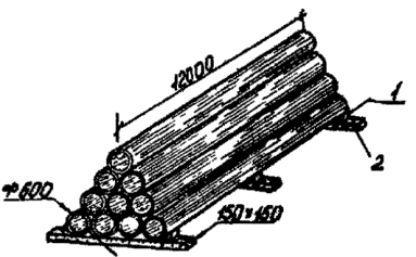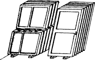 обрезного пиломатериала: 6.4. Изделия из дерева6.4.1. Окна и балконные двери (переплеты, дверные полотна, коробки, подоконные доски, фрамуги) изготовляют из древесины сосны, лиственницы, кедра, ели и пихты, а в помещениях, с нормальным температурно-влажностным режимом для изготовления внутренних дверей и фрамуг разрешается применять бук, березу, ольху, осину, тополь. 6.4.2. Окна и балконные двери должны поставляться изготовленными в соответствии с требованиями ГОСТа 23166-78, подоконные доски - по ГОСТ 17280-79, деревянные фрезерованные детали для строительства - по ГОСТ 8242-75. 6.4.3. Окна и балконные двери поставляют собранными в блоки, в состав которых входят коробки и вогнанные в них и навешенные на петли элементы их заполнения - створки, форточки, фрамуги, дверные полотна с врезанными приборами. 6.4.4. Лицевые стороны столярных изделий, а также стороны, сопрягаемые между собой, должны быть чисто простроганы, на столярных изделиях недопустимы покоробленность и перекосы более чем на 3 мм в любом направлении. На лицевой поверхности изделий не должно быть следов клея. Сучки и прочие механические повреждения должны быть заделаны вставками на клею, тщательно выполнены без щелей и зазоров. 6.4.5. На каждом изделии должен быть нанесен на нелицевой поверхности штамп ОТК предприятия и номер приемщика ОТК. 6.4.6. При перевозке окна и двери должны быть защищены от действия атмосферных осадков, а также от механических повреждений и загрязнения. 6.4.7. Оконные и дверные блоки следует хранить в вертикальном положении на подкладках в сухих проветриваемых помещениях, рассортированными по типам, размерам и сортам. При отсутствии в складском помещении пола изделия укладывают на специальные подкладки высотой 70 см. На рис.12 показан способ хранения столярных изделий. 6.4.8. Оконные и дверные блоки принимают поштучно по типам и маркам, в соответствии со спецификацией. Блоки подвергают наружному обмеру, а оконные переплеты и дверные полотна - по площади. Площадь определяют с точностью до 0,01 м2. На рис. 3 показан контейнер для транспортирования стеклодверей. Рис. 12. Складирование столярных изделий