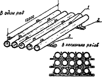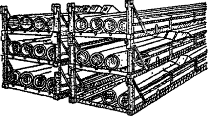 В марке материала цифра обозначает толщину листа в мм. 9.4.1. При перевозке и хранении на складе асбестоцементные листы должны быть уложены в стопы на гладком основании или деревянных прокладках, площадь которых должна быть больше площади листа. В каждой стопе должно быть не более 70 листов. 9.4.2. Асбестоцементные листы и детали при хранении должны быть уложены на специальные поддоны в стопы по сортам, при этом количество листов в стопе не должно превышать: для листов УВ-6 и УВ-7,5, соответственно 135 и 110 шт., а деталей - 25 пар. 9.5. Листы асбестоцементные волнистые среднего и высокого профиля по ГОСТ 20430-75 и ГОСТ 24986-81.9.5.1. При перевозке и хранении листы и крепления к ним должны быть уложены в стопы по 100 шт. и закреплены так, чтобы они не повреждались при движении транспорта или от внешних воздействий. 9.5.2. Площадка для хранения асбестоцементных волнистых листов должна иметь небольшой уклон для стока атмосферных осадков. При укладке листов в штабель под нижний лист штабеля, перпендикулярно гребням волн, следует подложить два бруса на расстоянии от концов листа, равном 1/4 его длины. Листы укладываются лицевой стороной кверху. 9.5.3. Асбестоцементные листы усиленного профиля по ГОСТ 8423-75 при хранении должны быть уложены на поддоны в стопы. Количество листов в стопе не должно превышать 100 шт., количество деталей - 50 шт. Для доставки листов усиленного профиля (ВУ) с базы комплектации на объекты строительства надлежит применять контейнер-поддон № 20 (разработан трестом Мосоргстрой). 9.6. Трубы асбестоцементные9.6.1. Трубы асбестоцементные подразделяются на водопроводные напорные (четырех марок: ВТ3, ВТ6, ВТ9, ВТ12, соответствующие рабочему гидравлическому давлению в 3, 6, 9 и 12 атм) и канализационные безнапорные (двух видов: КМ - муфтовые и КР - раструбные). 9.6.2. Водопроводные трубы отгружают заказчику по спецификации последнего комплектно с асбестоцементными или чугунными муфтами и резиновыми кольцами. Асбестоцементные трубы для безнапорных трубопроводов изготавливают с внутренними размерами от 100 до 600 мм и длиной 3,0-4,0 м. 9.6.3. Трубы и муфты должны быть прямыми, цилиндрической формы, без трещин. Концы труб и муфт не должны быть обломаны. Царапины и сдиры на внутренней обточенной поверхности муфт и на наружной поверхности обточенных концов труб недопустимы. 9.6.4. Асбестоцементные трубы и муфты можно хранить под навесом или на открытой ровной площадке в штабелях высотой до 1,2 м. Трубы укладывают горизонтальными, а муфты - вертикальными рядами. 9.6.5. Для пакетирования, погрузки и разгрузки асбестоцементных труб рекомендуется пользоваться захватом, разработанным трестом Мосоргстрой. Количество захватываемых труб в пакете: 170 шт. - при внутреннем диаметре 100 мм; 85 шт. - при диаметре 141 мм; 50 шт. - при диаметре 189 мм. 9.6.6. При отправке с базы комплектации на объекты строительства асбестоцементных стволов мусоропроводов следует пользоваться контейнером № 8, (разработан трестом Мосоргстрой), вмещающим 12 труб, общей грузоподъемностью 2000 кг. На рис.19 показаны контейнеры с элементами ствола мусоропровода. 10. МАТЕРИАЛЫ РУЛОННЫЕ, КРОВЕЛЬНЫЕ И ГИДРОИЗОЛЯЦИОННЫЕ10.1. Рубероид10.1.1. Рубероид по ГОСТ 10923-82 должен применяться в соответствии с действующими строительными нормами и правилами на производство кровельных и гидроизоляционных работ. 10.1.2. В зависимости от назначения рубероид п