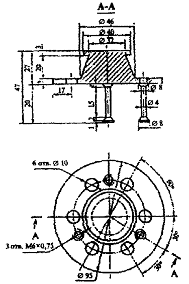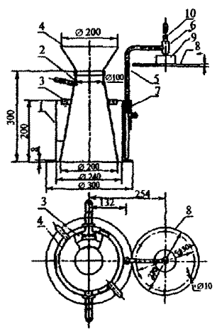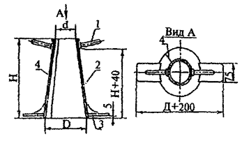 4.1.2.2 При подготовке конуса и приспособлений к испытаниям все соприкасающиеся с бетонной смесью поверхности следует очистить и увлажнить. Каждый слой на его высоту уплотняют штыкованием металлическим стержнем: в нормальном конусе - 25 раз, в увеличенном - 56 раз. Бетонной смесью марок П4 и П5 конус заполняют в один прием и штыкуют 10 раз. Конус во время заполнения и штыкования должен быть плотно прижат к листу. 4.1.2.4 После уплотнения бетонной смеси воронку снимают, избыток смеси срезают кельмой вровень с верхними краями конуса, и заглаживают поверхность бетонной смеси. Время от начала заполнения конуса до его снятия не должно превышать 3 мин. 4.1.2.5 Конус плавно снимают с отформованной бетонной смеси в строго вертикальном направлении и устанавливают рядом с ней. Время, затраченное на подъем конуса, должно составлять 5 - 7 с. 4.1.2.6 Осадку конуса бетонной смеси определяют, укладывая гладкий стержень на верх формы и измеряя расстояние от нижней поверхности стержня до верха бетонной смеси с погрешностью не более 0,5 см. Если после снятия формы конуса бетонная смесь разваливается, измерение не выполняют, и испытание повторяют на новой пробе бетонной смеси. Осадку конуса бетонной смеси, определенную в увеличенном конусе, приводят к осадке нормального конуса умножением осадки увеличенного конуса на коэффициент 0,67. 4.1.2.7 Осадку конуса бетонной смеси вычисляют с округлением до 1,0 см, как среднеарифметическое результатов двух определений из одной пробы, отличающихся между собой не более чем: на 1 см при OK £ 9 см; » 2 см » OK = 10 -15 см; » 3 см » OK ³ 16 см. При большем расхождении результатов определение повторяют на новой пробе. 4.1.2.8 Расплыв конуса бетонной смеси РК оценивают по нижнему диаметру лепешки (в см), образовавшейся в результате расплыва бетонной смеси при определении подвижности по осадке нормального конуса по 4.1.2.5. 4.1.2.9 Расплыв конуса бетонной смеси определяют измерением металлической линейкой диаметра расплывшейся лепешки в двух взаимно перпендикулярных направлениях с погрешностью не более 0,5 см. 4.1.3 Правила обработки результатов испытаний 4.1.3.1 Осадку и расплыв конуса бетонной смеси определяют дважды. Общее время испытания с начала заполнения конуса бетонной смесью при первом определении и до момента измерения осадки конуса при втором определении не должно превышать 10 мин. 4.1.3.2 Расплыв конуса бетонной смеси вычисляют с округлением до 1,0 см, как среднеарифметическое значение результатов двух определений расплыва конуса из одной пробы, отличающихся между собой не более чем на 3 см. При большем расхождении результатов определение повторяют на новой пробе. 4.2 Определение жесткости бетонной смеси Жесткость бетонной смеси характеризуют временем вибрации в секундах, необходимым для уплотнения бетонной смеси. 4.2.1 В зависимости от марки бетонной смеси по удобоукладываемости по ГОСТ 7473 применяют следующие методы определения жесткости: - на установке типа Вебе (рисунок 2) - смесей марок Ж1-Ж4 и СЖ1-СЖ3; - по методу Красного (рисунок 3) - смесей марок Ж1-Ж4; - по методу Скрамтаева - смесей марок Ж1-Ж4. 4.2.2 Средства испытания Для определения жесткости бетонной смеси применяют: - установку типа Вебе (рисунок 2); - прибор Красного (рисунок 3) и металлическую форму по ГОСТ 22685; - конус для метода Скрамтаева (размеры в таблице 1) и металлическую форму ФК-200 по ГОСТ 22685; - виб