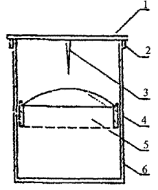 Отношение высоты сосуда к его диаметру должно быть от 1 до 2. Пригружающий пуансон 5 должен быть выполнен в виде металлического кольца высотой 20 мм и наружным диаметром на 3 мм меньше внутреннего диаметра сосуда и иметь дно из сетки с ячейками размером 1,2 мм и проволочную петлю для поднятия его из сосуда. Металлическая пластина 1 должна иметь ширину 15 мм, толщину 5 мм, расстояние между ограничителями должно быть равно наружному диаметру сосуда. Стрелка 3 длиной 22 мм должна иметь конусообразную форму с острым концом. Градуировка объёмомера заключается в установлении объема его сосуда (постоянной объёмомера). 6.1.2.1 В пустой цилиндрический сосуд помещают пригружающий пуансон, устанавливают на сосуд металлическую пластину со стрелкой, и наливают воду до тех пор, пока ее поверхность не придет в соприкосновение с острием стрелки, что фиксируют по моменту соприкосновения острия стрелки с его отражением в воде. Постоянную объёмомера V0 вычисляют по формуле