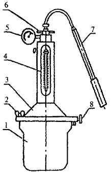 где тВ - масса влитой воды, г, определяемая с погрешностью не более 1 г; rВ - плотность воды, принимаемая равной 1,0 г/см3. Градуировка поромера заключается в измерении вместимости чаши и цены деления прибора. 6.1.3.1 Чаша и крышка поромера должны иметь жесткую конструкцию, не допускающую изменение объема прибора при приложении давления до 200 кПа. Соединение крышки и чаши должно иметь уплотнение, обеспечивающее герметичность прибора. Внутренняя поверхность крышки должна иметь угол к плоскости ее основания не менее 30°, чаша - плоское дно. Отношение диаметра чаши к ее высоте должно составлять 1±0,25. 1 - металлическая пластина; 2 - ограничители; 3 - стрелка; 4 - петля; 5 - пригружающий пуансон; 6 - цилиндрический сосуд Рисунок 4 - Объёмомер 1 - чаша; 2 - накидной болт; 3 - крышка; 4 - водомерная труба; 5 - манометр; 6 - входной вентиль; 7 - ручной насос; 8 - сливной вентиль Рисунок 5 - Поромер Вместимость чаши принимают в зависимости от наибольшей крупности зерен фракции заполнителя по таблице 4. Таблица 4