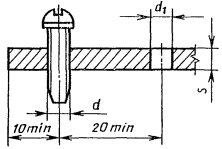 2.3. Допускается для изготовления винтов применять не указанные в табл. 3 марки материалов, механические свойства которых не ниже свойств марок материалов, установленных табл. 3. В этом случае в обозначении винта вместо условного обозначения материалов указывают его марку. 2.4. Самонарезающие винты должны подвергаться термической или химико-термической обработке. Твердость винтов с крупным шагом резьбы должна быть HRCэ 57 ... 63, с мелким - HRCэ 37 ... 47. Поверхностная твердость винтов после химико-термической обработки должна быть не менее 450 HV03; 83HR15N. Глубина слоя химико-термической обработки должна быть: для диаметров от 2 до 3 - 0,04 - 0,01 мм; для диаметров от 4 до 6 - 0,05 - 0,18 мм; для диаметров от 7 - 0,1 - 0,23 мм. (Измененная редакция, Изм. № 1, 2). 2.5. Шаг и угол профиля резьбы, углы конической части стержня должны обеспечиваться точностью изготовления инструментов или копиров, для которых допускаемое отклонение от номинального значения не должно превышать ± 10 %. 2.6. Уменьшение наружного диаметра винта в пределах поля допуска может быть только в сторону конца винта. 2.7. Самонарезающие винты с заостренным концом должны иметь цилиндрический стержень с полнопрофильной резьбой до конуса. 2.8. Для винтов, имеющих менее четырех витков резьбы, длина конического конца не должна превышать 30 % всей длины винта. (Новая редакция, Изм. № 2) 2.9. Резьба должна быть чистой, без задиров и заусенцев. Частичные подрезы, утолщения или надрывы витков не допускаются. 2.10. Виды покрытий и их условное обозначение по ГОСТ 1759.0-87. 2.11. Допуски размеров, формы и расположения поверхностей винтов - по ГОСТ 1759.1-82. Допускаемые дефекты поверхности винтов по ГОСТ 1759.2-82. (Новая редакция, Изм. № 2). 2.12. На винтах с заостренным концом не допускается притупление острия буравчика более 15 % от диаметра резьбы. (Новая редакция, Изм. № 2) 3. ПРАВИЛА ПРИЕМКИ3.1. Правила приемки винтов по ГОСТ 17769-83. 4. МЕТОДЫ КОНТРОЛЯ4.1. Визуальный осмотр винтов, проверка размеров, шероховатости поверхностей, дефектов поверхности, твердости, толщины покрытия и измерения глубины обезуглероженного слоя - по ГОСТ 1759.0-87. При отсутствии у винтов площадки для измерения твердости, измерение твердости следует производить на образцах-свидетелях, прошедших термообработку вместе с винтами. Допускается не контролировать радиус сферы головки, высоту сферы полупотайной головки, диаметр и глубину крестообразного шлица, радиусы под головкой винтов при условии обеспечения этих размеров инструментом или технологией изготовления. 4.2. Проверку винтов на ввинчивание проводят по требованию потребителя следующим методом: винты ввинчивают в испытательную стальную пластину; твердость стальной испытательной пластины - 125...165 НВ, содержание углерода в стали пластины должно быть не более 0,23 %; толщина пластины S, а также диаметры отверстий должны соответствовать указанным на черт. 3 и в табл. 4. Конец ввернутого винта должен выходить из пластины не менее чем на два витка полного профиля резьбы. Винты, имеющие менее четырех витков резьбы, ввертываются в пластину с зазором между головкой и пластиной, не более допустимого недовода резьбы. После вывинчивания на витках не должно быть выкрашивания, трещин, сорванных или смятых витков резьбы и смятия опорных поверхностей шлица на головке. Черт. 3 Таблица 4 мм