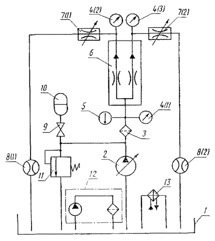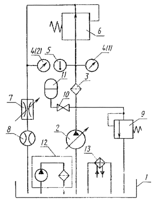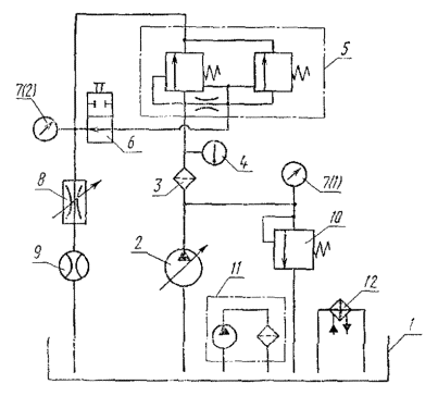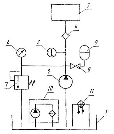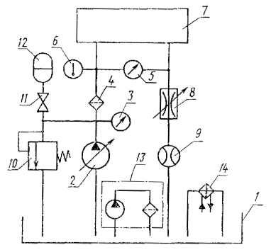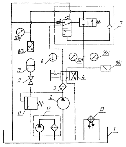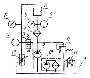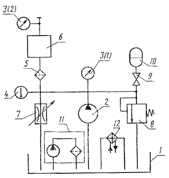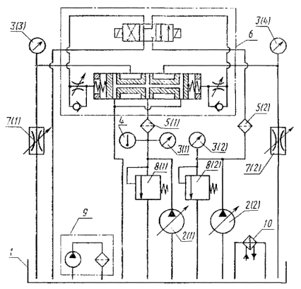 Примечания к табл. 1-3: 1. Знак «+» означает, что у указанных аппаратов данный показатель проверяется. 2. Номенклатура аппаратов - по ГОСТ 17752-81, приложение 3, схема. Термины, применяемые в стандарте, и их определения приведены в приложении 20. 3. Методы испытаний аппаратов, не вошедших в номенклатуру настоящего стандарта, устанавливают в стандартах или технических условиях на конкретные аппараты. 2. МЕТОДЫ ИСПЫТАНИЙ2.1. Общие требования 2.1.1. Измерения параметров - по ГОСТ 17108-86. 2.1.2. (Исключен, Изм. № 3). 2.1.3. Испытания должны проводиться на рабочей жидкости вязкостью 30-35 мм2/с (сСт). Если испытания аппарата проводят на рабочей жидкости, вязкость которой обеспечить в указанном интервале невозможно (вода, эмульсия), параметры проверяют при температуре этой жидкости 20-50°С. Если в стандартах или технических условиях параметры указаны при вязкости рабочей жидкости, отличной от установленной выше, допускается проводить испытания на рабочей жидкости с вязкостью, оговоренной в стандартах или технических условиях. (Измененная редакция, Изм. № 3). 2.1.4. Комбинированные аппараты, состоящие из двух или нескольких аппаратов, выполняющих самостоятельные функции (например, регулятор расхода с предохранительным клапаном), следует испытывать по методике, установленной для каждого аппарата. Примечание. Приемосдаточные испытания допускается проводить на изделиях, на которые устанавливаются аппараты, если аппараты и изделия изготовлены одним и тем же предприятием. (Измененная редакция, Изм. № 2). 2.1.6. Требования к средствам измерений - по ГОСТ 17108-86. 2.1.7. Перед проведением типовых испытаний должно быть проверено соответствие деталей и сборочных единиц гидроаппаратов рабочим чертежам, а также проведен микрометрический обмер основных деталей. (Измененная редакция, Изм. № 3). 2.1.8. Перед проведением испытаний должны быть определены перепады давлений на участках гидролиний гидросистемы стенда, которые должны учитываться при измерении параметров испытываемого аппарата. 2.1.10. Испытания аппаратов начинают с проверки функционирования, прочности и герметичности. 2.2. Проведение испытаний 2.2.1. Проверка функционирования 2.2.1.1. В зависимости от типа гидроаппарата проверяют: проход рабочей жидкости в линиях, предусмотренных схемой гидроаппарата; характер и величину перемещения рабочих элементов гидроаппарата; регулирование расхода, давления, времени и т. д. 2.2.1.2. Проверка функционирования должна проводиться в два этапа: 1 - в начале испытаний при минимальном давлении; 2 - после проверки наружной герметичности и прочности при минимальном и максимальном давлениях управления и номинальном давлении в основных гидролиниях. (Измененная редакция, Изм. № 2). 2.2.1.3. При типовых и периодических испытаниях функционирование необходимо проверять при максимальной температуре рабочей жидкости, а также при других температурах, указанных в стандартах или технических условиях на конкретные аппараты. (Измененная редакция, Изм. № 2, 3). 2.2.2.1. Проверке должны подвергаться все полости, в которых во время функционирования гидроаппарата возможно создание избыточного давления. Схема стенда для проверки прочности приведена в приложении 1. 2.2.2.2. Прочность проверяют одновременным подводом рабочей жидкости к различным линиям гидроаппарата при давлении не менее 1,5 рном для каждой из этих линий с в