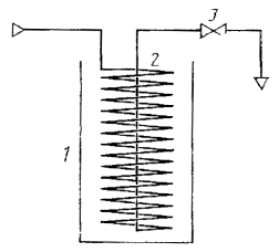 1 - сосуд для охлаждающей смеси; 2 - змеевик; 3 - игольчатый вентиль 3.2.2.3. После испарения основной массы при температуре окружающей среды и прекращения заметного испарения жидкости отстойник помещают в водяную баню с температурой (20±1)°С и выдерживают 20 мин при этой температуре. После этого измеряют объем остатка с точностью до 0,1 см3. 3.2.2.4. Если объем жидкого остатка превысит норму, то испытание повторяют из удвоенного количества вновь отобранной пробы. При проведении повторных и арбитражных испытаний отстойник заполняют сжиженным газом через охлаждающий змеевик. Змеевик устанавливают в сосуд для охлаждающей смеси, снабженный термометром, охлаждают до температуры на несколько градусов ниже температуры кипения основного компонента пробы и присоединяют к пробоотборнику или пробоотборной точке. 3.2.2.5. Открывая вентили на пробоотборнике или пробоотборной точке и змеевике, промывают змеевик сжиженным газом. Затем отстойник наполняют пробой сжиженного газа, выходящей из змеевика, до метки 100 см3, не допуская выброса пробы из отстойника. Далее повторяют операцию испарения газа и измеряют количество жидкого остатка по пп. 3.2.2.2 и 3.2.2.3. 3.2.2.6. Если при сжиженном газе имеется свободная вода, то после испарения газа она остается на дне и стенках отстойника. При затруднениях в визуальной идентификации свободной воды в жидком остатке ее наличие определяют с помощью водорастворимого индикатора. Для этого в отстойник вносят на кончике сухой стеклянной палочки или проволоки несколько кристаллов тимолового синего. В углеводородном жидком остатке тимоловый синий не растворяется и не окрашивается. Окрашивание жидкости указывает на наличие воды. В щелочной среде тимоловый синий окрашивается в синий цвет. Для определения наличия щелочи в жидком остатке допускается применять в качестве индикатора фенолфталеин. В отстойник добавляют 100 см3 дистиллированной воды, предварительно проверенной на нейтральность, и 2-3 капли фенолфталеина. При отсутствии окраски раствора в розовый или красный цвет фиксируют отсутствие щелочи, при окраске раствора - фиксируют присутствие щелочи. 3.2.2.7. (Исключен. Изм. № 2). 3.2.3. Два результата определения, полученные одним исполнителем, признаются достоверными (с 95%-ной доверительной вероятностью), если абсолютное расхождение между ними не превышает 0,1 %. (Введен дополнительно, Изм. № 1). Пункты 3.3.1. – 3.3.3 (Исключены. Изм. № 2). 4. ТРАНСПОРТИРОВАНИЕ И ХРАНЕНИЕ4.1. Сжиженные углеводородные газы транспортируют железнодорожным, автомобильным и водным транспортом в соответствии с правилами перевозок опасных грузов, действующих на соответствующем виде транспорта, и правилами устройства и безопасной эксплуатации сосудов, работающих под давлением, утвержденными в установленном порядке. (Измененная редакция, Изм. № 1). 4.2. Хранение сжиженных газов - по ГОСТ 1510. 5. ГАРАНТИИ ИЗГОТОВИТЕЛЯ5.1. Изготовитель гарантирует соответствие качества сжиженных газов требованиям настоящего стандарта при соблюдении условий транспортирования и хранения. 5.2. Гарантийный срок хранения - 3 месяца со дня отгрузки. (Измененная редакция, Изм. № 1). ПРИЛОЖЕНИЕ
