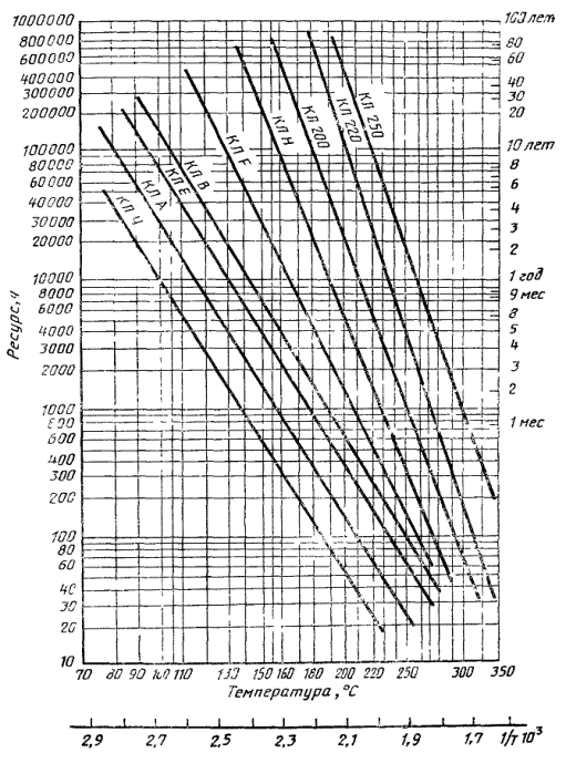 * Продолжительность равна примерно 1/10 ожидаемого ресурса при базовом ресурсе 20000 ч. ПРИЛОЖЕНИЕ 3Рекомендуемое ТИПОВЫЕ ГРАФИКИ ЗАВИСИМОСТИ ОТ ТЕМПЕРАТУРЫ СРЕДНЕГО РЕСУРСА СИСТЕМЫ ИЗОЛЯЦИИ ЭЛЕКТРИЧЕСКИХ МАШИН И АППАРАТОВ С ОБМОТКОЙ ИЗ КРУГЛЫХ ПРОВОДОВ С ЭМАЛЕВОЙ, ЭМАЛЕВО-ВОЛОКНИСТОЙ И ВОЛОКНИСТОЙ ИЗОЛЯЦИЕЙГрафики составлены в соответствии с табл. 2 приложения 2 к настоящему стандарту и представляют собой обобщение результатов испытаний материалов и систем изоляции по методикам ГОСТ 10519-76 или по другим соответствующим методикам (см. черт.) Графики могут быть использованы для ориентировочных расчетов допустимых превышений температуры обмоток в изделиях со средним ресурсом, отличающимся (в меньшую* или большую сторону) от среднего ресурса изделий общего назначения, а также для сравнения результатов определения нагревостойкости новых материалов и систем изоляции. * При этом должны быть учтены имеющиеся данные по ограничению наибольших температур в соответствии с п. 4.8. Если для конкретных систем изоляции имеются графики зависимости от температуры среднего ресурса этих систем изоляции, следует пользоваться графиками для конкретных систем изоляции. ПРИЛОЖЕНИЕ 4Обязательное ОБРАБОТКА ЭКСПЕРИМЕНТАЛЬНЫХ ДАННЫХ ДЛЯ ПОЛУЧЕНИЯ ЗАВИСИМОСТИ МЕЖДУ РЕСУРСОМ И ТЕМПЕРАТУРОЙ1. Зависимость ресурса от температуры выражают формулой (3) полученной из формулы 2. где