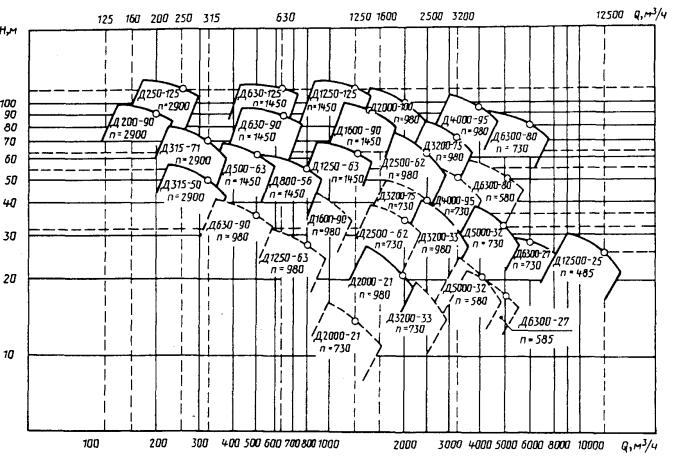 подачей до 1600 м 2. Основные параметры насосов в номинальном режиме указаны при работе насосов на воде с температурой 293 К (20 °С). 3. (Исключен, Изм. № 1). 4. Производственные допустимые отклонения напоров ±5 %. 5. Значение КПД приведено для оптимального режима, который должен находиться в пределах рабочей части характеристики. (Измененная редакция, Изм. № 1). ______________ Таблица 2. (Исключена, Изм. № 1). 2. Допускается работа насосов согласно приложению 1 при пониженной частоте вращения. В этом случае основные параметры должны быть приведены в НТД на насосы конкретных типов и находиться в пределах требований, установленных приложением 1. Допускается также использование насосов, частота вращения которых превышает указанную в табл. 1 и приложении 1, при этом основные параметры должны быть приведены в НТД и соответствовать требованиям табл. 1 и приложения 1. 3. Области работы насосов по полю Q-H приведены в приложении 1. 2, 3. (Измененная редакция, Изм. № 1). 4. Рабочая часть характеристики не должна выходить за пределы диапазона подач от 0,7 до 1, 2 Qном. 5. Насосы следует изготовлять с рабочими колесами, обеспечивающими параметры, приведенные в табл. 1. Допускается по согласованию потребителя с изготовителем изготовление насосов с обточкой рабочего колеса по наружному диаметру (число обточек не более двух). Значения основных параметров должны быть указаны в НТД на насосы конкретных типов. При этом снижение значений КПД, указанных в табл. 1, должно быть не более 3 % для первой обточки и не более 8 % - для второй. (Измененная редакция, Изм. № 1). 6. (Исключен, Изм. № 1). 7. Для обеспечения параллельной работы по требованию заказчика производственные допустимые отклонения напоров могут быть установлены в пределах ±2 %. 8. Условное обозначение насосов должно соответствовать структурной схеме, приведенной в приложении 3. ПРИЛОЖЕНИЕ 1 Поля Q-Н