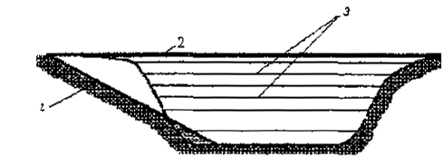 Рис.3 Схема высотного размещения котлована в основании полигона 1 - кавальер грунта для изолирующих слоев; 2 - уровень поверхности участка до разработки котлованов; 3 - горизонтальное основание; 4 - промежуточный вал Дренажный слой предусматривается для аварийных ситуаций и контроля выхода фильтрата. При экономическом обосновании возможно создание искусственного противофильтрационного экрана из слоя глины с коэффициентом фильтрации 10-8…10-7см/с. толщиной 0,3-0,4 м. Использование в качестве противофильтрационных оснований материалов, не оговоренных настоящей инструкцией, возможно только по согласованию с местными органами санэпиднадзора и охраны природы и по экспертному заключению отдела санитарной очистки городов и утилизации отходов Академии коммунального хозяйства им.К.Д. Памфилова. 1.16. Отвод земельного участка под складирование ТБО на территории оврага должен включать его верховья, что гарантирует сбор и удаление талых и дождевых вод более простыми методами. Разработка грунта для изоляции решается с учетом принципов, изложенных в пп. 1.15; 1.17. Участок оврага по длине разбивается, начиная с верховья, на этапы строительства. Каждая очередь строительства с пониженной стороны защищается от оползней земляной плотиной. Схема высоконагружаемого полигона для ТБО по многокаскадной схеме складирования в овраг приведена на рис. 4. Каждая плотина рассчитывается на экстремальные условия с учетом статической устойчивости удерживаемых ТБО, насыщенных водой. Проект организации складирования ТБО в выработанных карьерах (глубоких котлованах) должен обеспечивать съезд и разгрузку мусоровозов на нижней отметке с послойным заполнением карьера по высоте. Если отведенная под полигон часть карьера не имеет существующего съезда, то земельный участок под складирование ТБО в выработанных карьерах (глубоких котлованах) должен включать площадку для устройства съезда (пандус) в выемке, вне котлована (рис. 5, поз. 1) с уклоном 5%. Участок должен также предусматривать возможность разработки и получения грунта для изоляции ТБО (рис. 5, поз. 4). Часть пандуса непосредственно в границах карьера проектируется в одном из вариантов: с устройством насыпи из грунта или отходов строительства, и в полунасыпи - полувыемке в откосе котлована.