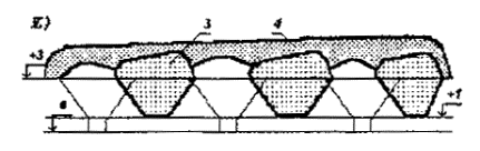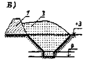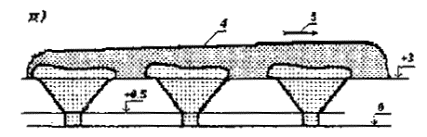 Рис.5 Схема полигона на участке глубоко выработанного карьера а - разрез полигона по съезду (пандусу) в карьер; б - план части карьера; 1 - трасса съезда (пандуса) в выемке; 2 - верхний изолирующий слой высотой 2,25м и толщиной 1 м (с учетом усадки ТБО); 3 -рабочие слои уплотненных ТБО с промежуточной изоляцией; 4 - участки разработки грунта для обеспечения изоляции; 5 - отрезок трассы съезда в насыпи или в полунасыпи -полувыемке. Длина одной траншеи должна проектироваться с учетом обеспечения приема ТБО: в период температур свыше 0°С в течение 1-2 мес., в период температур ниже 0°С - на весь период промерзания грунтов. Заложение откосов траншей в грунтах естественной влажности принимается с учетом их устойчивости при динамических нагрузках на бровке в соответствии с п. 9.10 и 9.11 табл. 4 СНиП III-4-80 "Техника безопасности в строительстве", данные которых применительно к полигонам ТБО приведены в табл. 1.2. Размер участка складирования должен обеспечивать прием ТБО с размещением их в одном ярусе в течении не менее 5 лет. Высотная траншейная схема проектируется с устройством траншей в 2-3 яруса по высоте (рис. 6). Отметка основания траншей 2-го яруса выполняется на 1 м выше отметки основания 1-го яруса. Изолирующим материалом траншей 2-го и 3-го ярусов служит смесь грунта и частично минерализованных ТБО. Санитарные и эксплуатационные условия устройства траншей 2-го и 3-го ярусов приведены в п. 2.9. На рис. 6 представлена траншейная схема в условиях песчаных и супесчаных грунтов. Траншейная схема применяется для полигонов, принимающих 120 тыс. м3/год ТБО и менее. 1.18. Непосредственное складирование ТБО в воду на болотистых и заливаемых паводковыми водами участках не допускается. Использованию болотистых и заливаемых паводковыми водами участков должна предшествовать организация подсыпки инертными материалами на высоту, превышающую на 1 м максимальный уровень поверхностных и паводковых вод. На подсыпке устраивается водоупорный экран. Заложение откосов траншей в грунтах естественной влажности