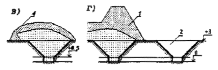 Рис.4 Высоконагружаемый полигон для твердых бытовых отходов по многокаскадной схеме а - схематический план; б - схематические продольный и поперечный разрезы, г - уступы в основании с обратным уклоном; 1 - нагорная канава; 2 - подъездная дорога; 3 - земляная плотина; 4 - самотечная канализация фильтрата; 5 - сборно-разборный распределительный филътратопровод; 6 - магистральный напорный фильтратопровод; 7 - насосная станция фильтрата; 8 - хозяйственная зона; 9 - противо-фильтрационный экран; 10 - ограждение; А - первый каскад I очереди складирования твердых бытовых отходов, Б - второй каскад I очереди; В - участок складирования во II очередь; Г - участок складирования отходов на перспективу; 220-250 -условные отметки горизонталей. 1.17. Траншейная схема складирования ТБО предполагает проектирование на участке складирования траншей глубиной 3-6 м и шириной по верху 6-12 м. Траншеи проектируются перпендикулярно направлению господствующих ветров. Грунт из траншей используется для изоляции ТБО. В климатических зонах, где возможно образование фильтрата, основание траншеи должно быть не менее, чем на 0,5 м заглублено в глинистые грунты.