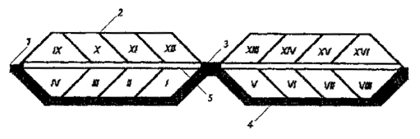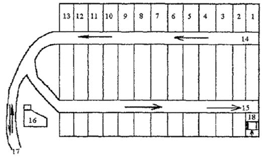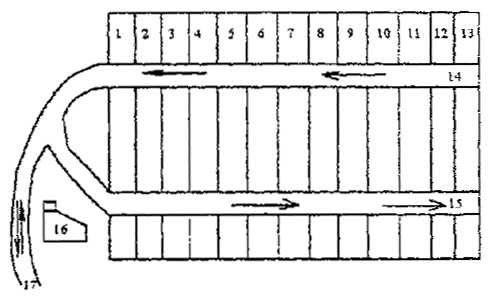 Рис. 10 Схема очередности заполнения карт методом "надвига" 1-12 - нумерация карт с учетом очередности заполнения их ТБО; 14 - временная дорога для выезда разгрузившихся мусоровозов; 15 - временная дорога для прибывающих мусоровозов с ТБО; 16 - хозяйственная зона; 17 - постоянная подъездная дорога к полигону; 18 - поперечная полоса карты с условным показом следа от двух гусениц и направления движения уплотняющего бульдозера.