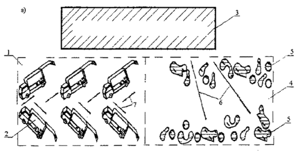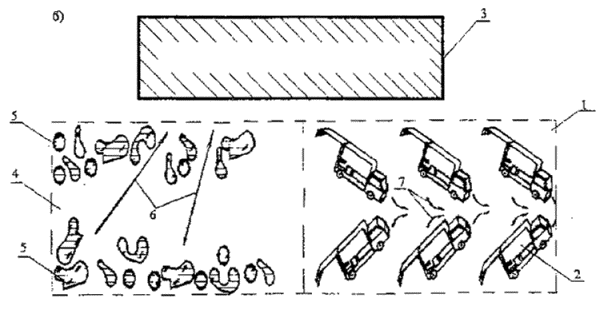 Рис.8 Схема разгрузки мусоровозов на полигоне ТБО а - первая и третья очереди разгрузки ТБО (8-10, 12-14 ч); б - вторая и четвертая очереди разгрузки ТБО (10-12, 14-16 ч); 1 - площадка разгрузки мусоровозов (в соответствии со сменностью); 2 - мусоровозы; 3 -рабочая карта (или траншея складирования); 4 - площадка разгруженных ТБО; 5 - ТБО; 6 - направление работы бульдозеров по сдвиганию ТБО к рабочей карете (траншее); 7 - направление выезда мусоровозов с площадки после разгрузки. Складирование ТБО методом "сталкивания" осуществляется сверху вниз. Высота откоса должна быть не более 2,5 м. При методе "сталкивания" в отличие от метода "надвита" мусоровозный транспорт разгружается на верхней изолированной поверхности рабочей карты, образованной в предыдущий день. Схема укладки отходов методом "сталкивания" приведена на рис. 11. По мере заполнения карт фронт работ движется вперед по уложенным в предыдущие сутки ТБО. Схема очередности заполнения карт методом "сталкивания" приведена на рис. 12. 2.5. Сдвигание разгруженных мусоровозами ТБО на рабочую карту осуществляется бульдозерами всех типов. Для повышения производительности бульдозеров (на 30-40%) необходимо применять отвалы, имеющие большую ширину и высоту (документация на изменение конструкции отвалов может быть получена в отделе санитарной очистки городов и утилизации отходов Академии коммунального хозяйства). Пример расчета дан в приложении 2. 2.6. Уплотнение уложенных на рабочей карте ТБО слоями по 0,5 м осуществляется тяжелыми бульдозерами массой 14 т и на базе тракторов мощностью 75-100 кВт (100-130 л.с.). Уплотнение слоями более 0,5 м не допускается. Уплотнение осуществляется 2-4 кратным проходом бульдозера по одному месту. Бульдозеры, уплотняющие ТБО, должны двигаться вдоль длиной стороны карты. При 2-кратном проходе бульдозера уплотнение ТБО составляет 570-670 кг/м3, при 4-кратном проходе - 670-800 кг/м3 Для обеспечения равномерной просадки тела полигона необходимо (два раза в год) делать контрольное определение степени уплотняемости ТБО. Пример расчета площадки рабочей карты и потребности в бульдозерах на операции уплотнения приведен в приложении 2. 2.7. Увлажнение ТБО летом необходимо осуществлять в пожароопасные периоды. Расход воды на полив принимается 10 л на 1 м3 ТБО. Пример расчета по увлажнению отходов приведен в приложении 2. 2.8. Промежуточная и окончательная изоляция уплотненного слоя ТБО осуществляется грунтом. При складировании ТБО на открытых, незаглубленных картах промежуточная изоляция в теплое время года осуществляется ежесуточно, в холодное время года - с интервалом не более трех суток. Слой промежуточной изоляции составляет 0,25 м., при уплотнении ТБ катками КМ - 305 0,75 м. Разработка грунта и доставка его на рабочую карту производится скреперами. Схема подачи грунта для изоляции ТБО на рабочих картах показана на рис. 13. Нормы времени в часах на разработку и перемещение грунта скреперами приведены в ЕНиР, сб. 2,2-1-14. Оценка дополнительного разравнивания и уплотнение грунта осуществляется по ЕНиР, сб. 2,2-1-15. Работа по изоляции строительными отходами нормируется как грунтом II группы. В зимний период в качестве изолирующего материала разрешается использовать строительные отходы, отходы производства (отходы извести, мела, соды, гипса, графита и т.д.). В виде исключения в зимний период допускается применять для изоляц