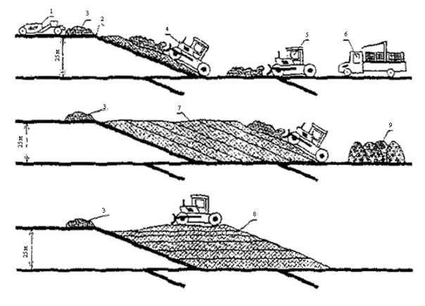 Рис.9 Схема укладки отходов методом "надвига" (снизу вверх) 1 - скрепер, доставляющий грунт; 2 - изолирующий слой; 3 - грунт для изоляции; 4 - бульдозер, уплотняющий ТБО; 5 - бульдозер, транспортирующий ТБО от места выгрузки из мусоровоза к рабочей карте; 6 - мусоровоз на месте выгрузки; 7 - укладка наклонных слоев; 8 - укладка тонких горизонтальных слоев; 9 - выгруженные ТБО