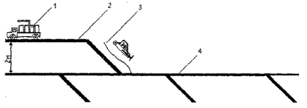 Рис.11 Схема укладки отходов методом "сталкивания" (сверху вниз) 1 - мусоровоз на месте разгрузки; 2 - изоляция, нанесенная в предыдущий день; 3 - уплотнение отходов на рабочей карте; 4 - изоляция, нанесенная 0,5-1 год назад.