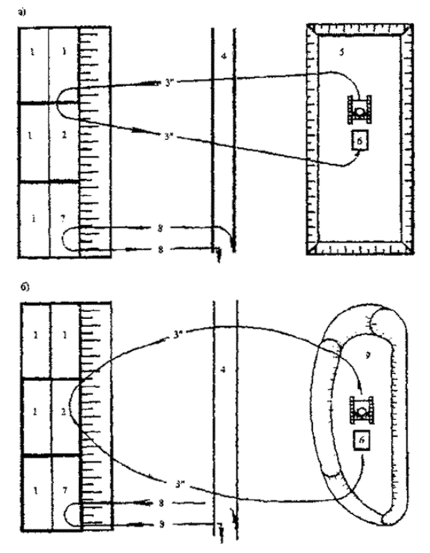 Рис.13 Схема подачи грунта для изоляции ТБО на рабочих картах с помощью скрепера а - при разработке котлована на второй очереди полигона, б - при разработке кавальеров или холмов; 1 - изолированные карты; 2 - изолируемая карта; 3 -трасса скрепера с грунтом; 4 - временная дорога для мусоровозов; 5 - котлован второй очереди полигона; 6 - скрепер; 7 - карта, заполняемая ТБО; 8 - трасса движения мусоровозов; 9 - кавальер или холм грунта. Сдвигание, уплотнение и изоляция ТБО при траншейной схеме2.9. Загрузка ТБО в траншеи осуществляется с послойным уплотнением бульдозерами или катками-уплотнителями, перемещающимися вдоль траншеи. Участок складирования заполняется с превышением над отметкой участка на 1/3 глубины траншеи из-за последующего уплотнения отходов. В траншеях ТБО изолированы в процессе складирования по всему периметру. Изоляцию ТБО сверху, для полигонов этого типа, допускается производить один раз в 5 суток. По истечении 5 лет (как исключение 3 года) необходимо устройство траншей 2-го яруса по высотной траншейной схеме (см. п. 1.18) при условии получения заключения службами санэпиднадзора, что материал в траншее не привлекает мух и грызунов, а также в подразделениях пожарной охраны о его пожарной безопасности. Для получения указанных разрешений в 2-3 местах делается пробное разрытие. 2.10. Переносные сетчатые ограждения устанавливаются как можно ближе к месту разгрузки и складирования ТБО, перпендикулярно направлению господствующих ветров для задержания легких фракций отходов. Высота ограждений 4-4,5 м. Рама щитов выполняется из легких металлических профилей, обтягивается сеткой с размерами ячеек 40-50 мм. Ширина щитов принимается 1-1,5 м. Регулярно, не реже одного раза в смену, щиты очищаются от частиц отходов. Размеры участка, защищаемого переносным сетчатым ограждением, должны обеспечивать возможность выполнения работ без перестановки щитов в течение не менее недели. 2.11. Мерный столб (репер) устанавливается на карте для контроля высоты отсыпаемого 2-метрового слоя ТБО. Соблюдение заданной высоты слоя отсыпки обеспечивает равномерность осадки толщи полигона. С помощью репера контролируется степень уплотнения твердых бытовых отходов. Реперы выполняются в виде деревянного столба или отрезка металлической трубы, швеллера, двутавра. Деления наносятся яркой краской через каждые 0,25 м. На высоте 2 м на бульдозере делается белая черта, являющаяся подвижным репером. Контроль соблюдения требований охраны окружающей среды2.12. Основные операции по эксплуатации полигонов показаны на рис. 14. Соблюдение этой последовательности обеспечивает выполнение требований охраны окружающей среды. 2.13. Контроль за загрязнением грунтовых вод осуществляется с помощью взятия проб из контрольных колодцев, скважин или шурфов, заложенных по периметру полигона. Перед взятием пробы необходимо произвести откачку или водоотлив (вода в контрольных колодцах, скважинах и шурфах застаивается). Необходимо следить, чтобы при этой операции в воду вместе со шлангом или другими материалами не было внесено загрязнение. При повышении окисляемости грунтовых вод система орошения (рециркуляции) переносится на следующие карты. 2.14. Регулярной очистке подлежат водоотводные канавы, загрязнения из которых могут попасть в поверхностные воды. На участках, где в граничных водоотводных 