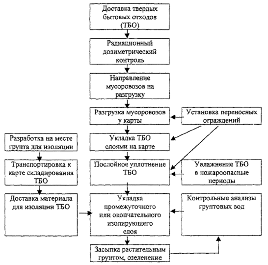 Рис.14 Основные технологические операции при эксплуатации полигонов В период сухой, жаркой погоды полигоны должны быть обеспечены средствами для увлажнения ТБО. На территории полигона категорически запрещается сжигание ТБО и сбор утиля. 2.17. С целью исключения несанкционированного складирования отходов, содержащих радионуклиды, при поступлении на полигон отходы проходят радиационный дозиметрический контроль. Для этих целей используются геологоразведочные поисковые приборы СРП-68-01 или СРП-88Н. 2.18. Промышленные отходы (ПО), допускаемые для совместного складирования с ТБО, должны отвечать следующим требованиям: иметь влажность не более 85%, не быть взрывоопасными, самовоспламеняющимися, самовозгорающимися. Основным санитарным условием является требование, чтобы токсичность смеси промышленных отходов с бытовыми не превышала токсичности бытовых отходов по данным анализа водной вытяжки. Заключение о возможности приема и совместного складирования ПО и ТБО выдается ЦГСЭН на основе анализов лаборатории диагностики полигона, либо анализов ЦГСЭН, проводимых по договорам с предприятиями-поставщиками отходов. Промышленные отходы IV класса опасности, принимаемые без ограничений в количественном отношении и используемые в качестве изолирующего материала, характеризуются содержанием в водной вытяжке (1л воды на 1 кг отходов) токсичных веществ на уровне фильтрата из твердых бытовых отходов, а по интегральным показателям - биохимической потребности в кислороде (БПК20) и химической потребности в кислороде (ХПК) - не выше 300 мг/л, они должны иметь однородную структуру с размером фракций менее 250 мм. Промышленные отходы IV и III классов опасности, принимаемые в ограниченном количестве (не более 30% от массы ТБО) и складируемые совместно с бытовыми, характеризуются содержанием в водной вытяжке токсичных веществ на уровне фильтрата из ТБО и значениями БПК20 и ХПК 3400-5000 мг/л. Перечень промышленных отходов III, IV классов опасности, допускаемых для совместного складирования, приводится в приложении 11. Закрытие полигона и передача участка под дальнейшее использование2.19. Закрытие полигона для приема ТБО осуществляется после отсыпки его на проектную отметку, установленную заданием, на высоконагружаемых полигонах со сроком эксплуатации не менее 5 лет допускается превышение проектной отметки на 10%. Последний слой отходов перед закрытием полигона засыпается слоем грунта с учетом дальнейшей рекультивации. При планировке изолирующего слоя необходимо обеспечивать уклон к краям полигона. 2.20. Устройство изолирующего слоя полигона определяется заданием по его рекультивации. Укрепление наружных откосов полигона должно проводиться с начала эксплуатации полигона по мере увеличения высоты складирования. Материалом для засыпки наружных откосов полигона служит предварительно снятый при его строительстве растительный грунт. Для защиты от выветривания или смыва грунта с откосов полигона необходимо производить их озеленение непосредственно после укладки изолирующего слоя. По склонам высаживаются защитные насаждения и устраиваются террасы. Выбор видов деревьев и кустарников определяется местными условиями и приводится в разделе 3 "Рекультивация территорий закрытых полигонов". 2.21. На участках, используемых, в последующем под открытые склады тары 